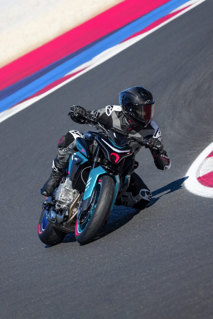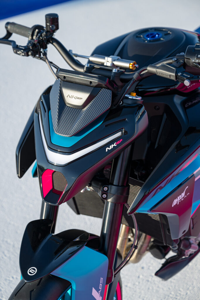 Zásadní roli hraje také aerodynamika a ergonomie – prototyp dostal sportovní doplňky, agresivnější posed a grafiku inspirovanou MotoGP paddockem, která jasně odkazuje na závodní působení CFMOTO Aspar Team.