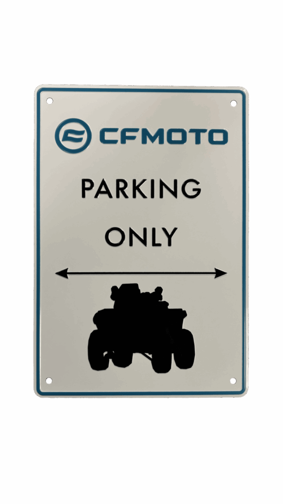 Závěsná plechová cedule s piktogramem čtyřkolky a textem „CFMOTO PARKING ONLY“ z kolekce originálních doplňků CFMOTO.