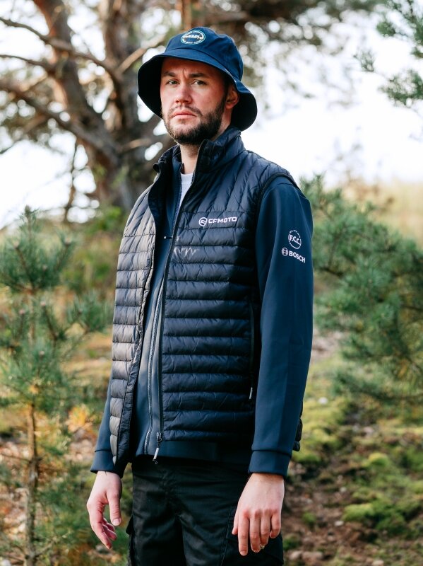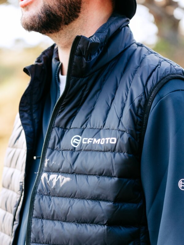 Lehká volnočasová péřová vesta z oficiální kolekce CFMOTO v tmavě modré až černé barvě.