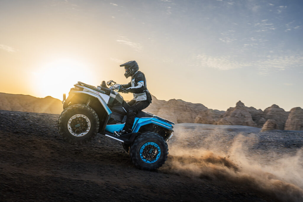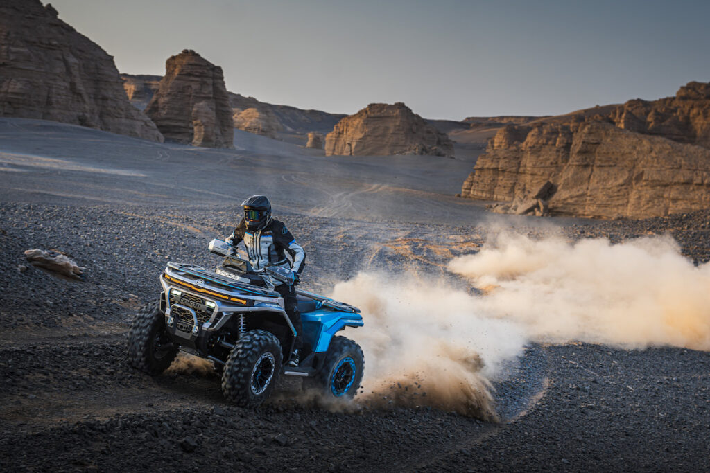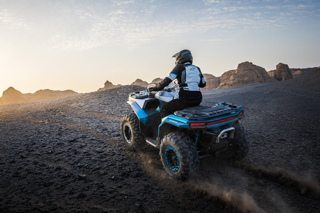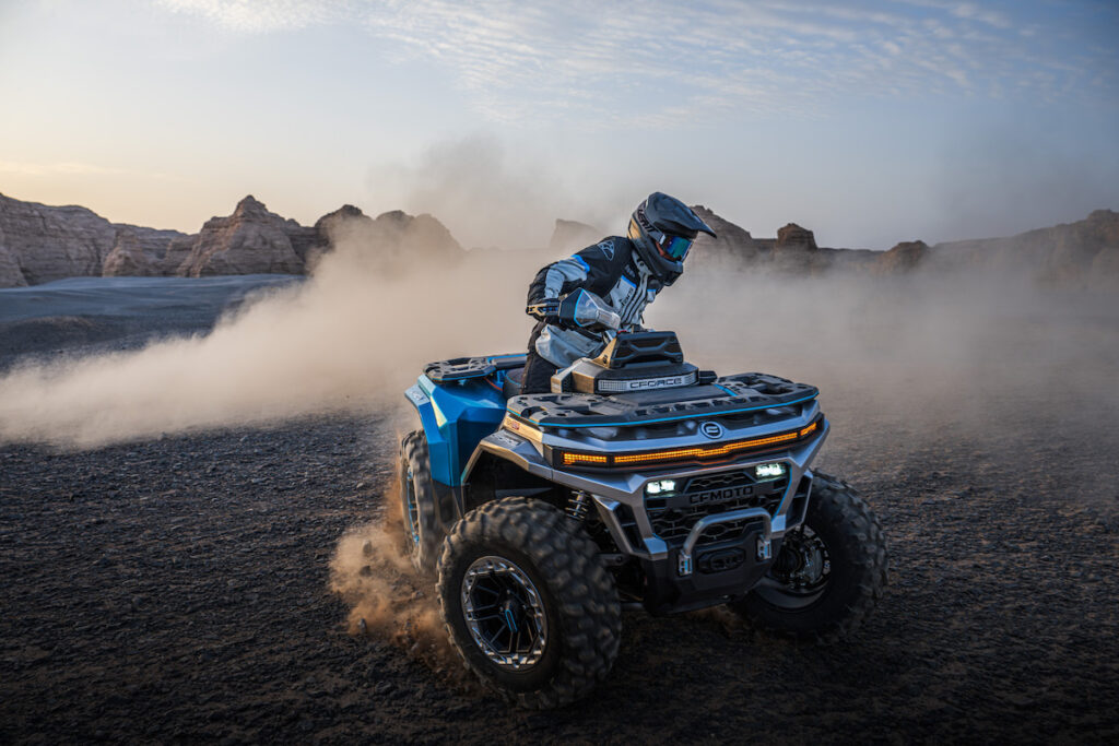 U čtyřkolek a zejména těch dlouhých bývá problém poloměr otáčení, neboli rejd. CFMOTO vyřešilo poloměr zatáčení technologií, která tu ještě nebyla a to aktivním řízením zadní nápravy. Kola se tak hydraulicky natáčí společně s těmi předními. K tomu jsou tu i aktivní brzdy, které umí přibrzďovat vnitřní kola a tím ještě snížit poloměr zatáčení!